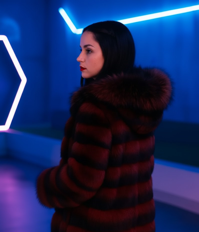 Ana de Armas stunned audiences in 2025 with winter style. She portrayed fearless Ok-ju moving through a neon-lit underground club confidently. She wore a deep maroon fur coat symbolizing power and elegance. The coat’s full-length silhouette flares with every stylish, deliberate step.