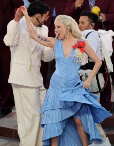 Lady Gaga dazzled everyone in a flowing sky-blue gown that radiated grace and movement. The gown displayed intricate pleating and a form-fitting bodice, accentuating her iconic fashion style. Additionally, a subtle ruffled hem created dramatic flair during her energetic stage performance. Meanwhile, a striking red floral corsage on her shoulder contrasted beautifully with the gown. Moreover, the corsage emphasized her bold and adventurous fashion instincts. With platinum blonde waves and red lips, Gaga evoked classic Hollywood glamour with modern edge. Consequently, her style perfectly complemented Bad Bunny’s contemporary and cutting-edge aesthetic.
