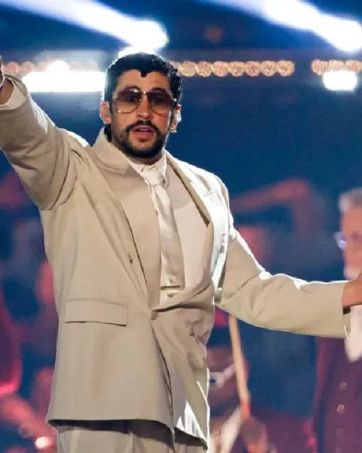 First, Bad Bunny stole the spotlight wearing a crisp, all-white double-breasted suit. Next, the suit blended modern tailoring with classic elegance, showcasing his refined fashion sense. Additionally, the oversized silhouette referenced high-fashion street style while staying sleek and stage-ready. He completed the outfit with a matching tie and a crisp white shirt. Moreover, he added tinted aviator sunglasses, introducing a subtle touch of superstar flair. Finally, the ensemble balanced showmanship with sophistication, making him approachable yet larger-than-life on stage.