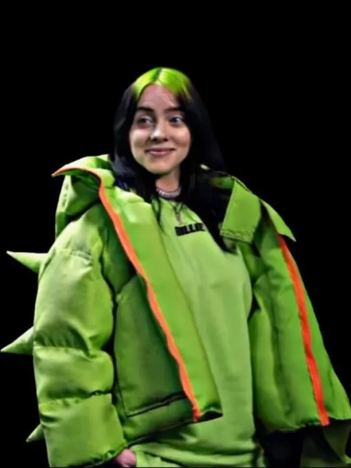 3. Billie Eilish Signature Sculptural Spikes and Orange Piping Neon Green Oversized Puffer Jacket
