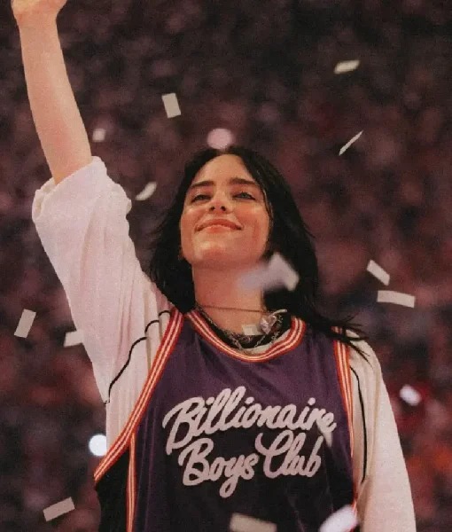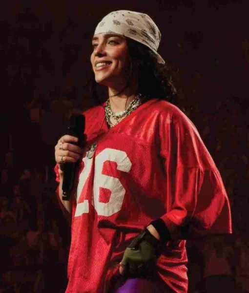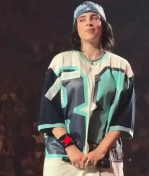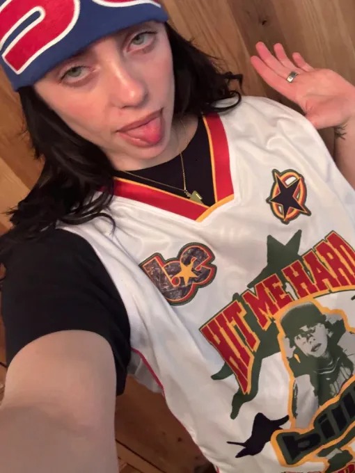 Billie wore this jersey during album visuals, pairing moody graphics with oversized athletic design. V-neck, short sleeves, bold artwork, and soft jersey material balanced comfort and stage presence.