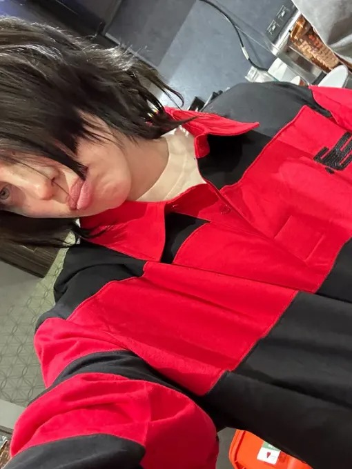 6. Billie Eilish BLOHSH Red and Black Striped Polo Long Sleeve Shirt with Oversized Jersey Fit