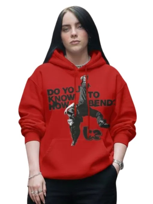 7. Billie Eilish Bend London Red Oversized Pullover Hoodie with Union Jack and Blohsh Logo Graphic