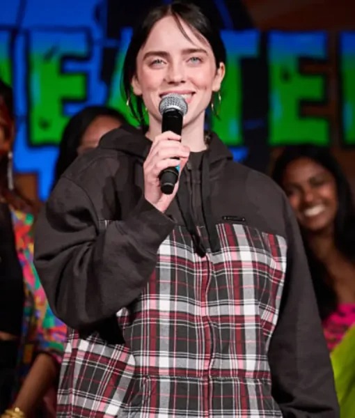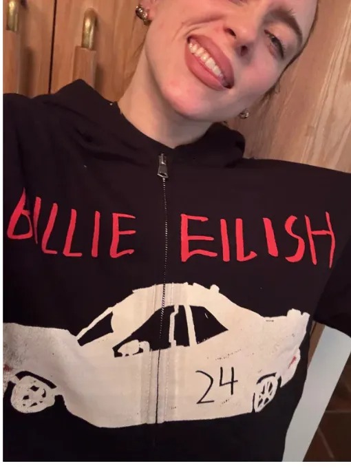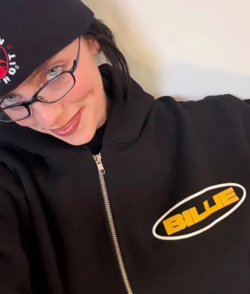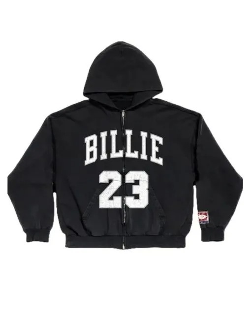 She wore this hoodie in merch collections, highlighting bold “BILLIE 23” branding and oversized street comfort. Fleece fabric, zip closure, hood, ribbed hems, and pockets completed functional fashion.