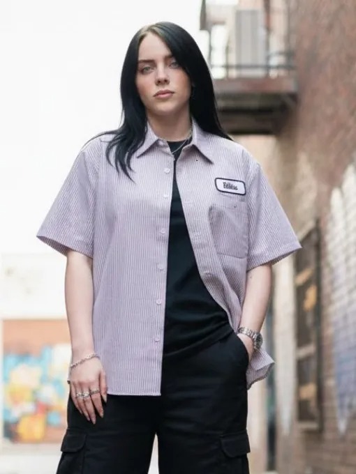 Billie wore this sustainability-driven shirt during her eco-conscious fashion era, merging workwear roots with oversized attitude. Upcycled cotton blend, striped design, button front, collar, and patch details reinforced individuality.