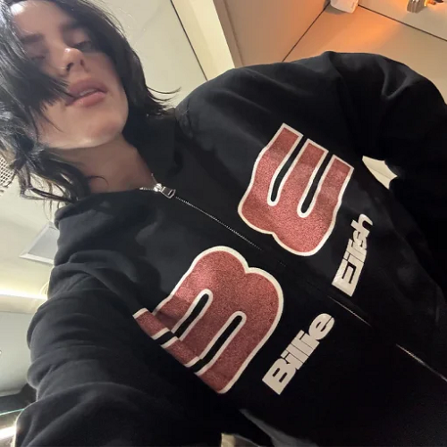 Billie styled this hoodie in casual and tour settings, highlighting graffiti influence and expressive branding. Soft fleece, kangaroo pocket, Blohsh logo, ribbed trims, and oversized structure delivered comfort with artistic street presence.