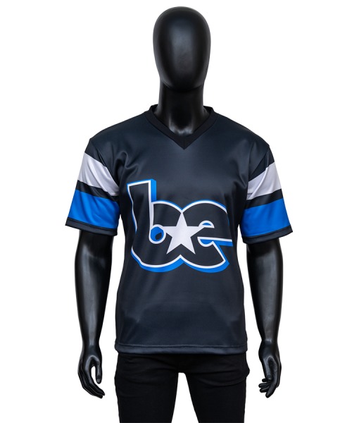 33. Billie Eilish Hit Me Hard And Soft V-Neck Blue & White Sleeve Stripes Front ‘b★e’ Logo, Back Monochrome Portrait Print Oversized Black Jersey