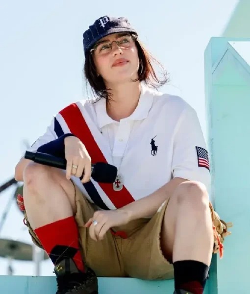 Billie wore this during her London tour stop, merging designer branding with tour identity. Polo collar, button placket, bold logos, and structured cotton build delivered crossover fashion appeal.