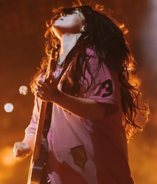 She sported this red athletic jersey during tour performances, pairing sporty energy with oversized proportions. Breathable mesh, drop shoulders, bold “26” graphics, and relaxed sleeves emphasized stage comfort and bold visual identity.