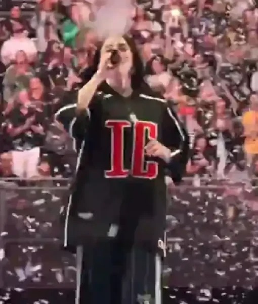 Billie wore this mesh jersey on stage, merging sports culture with music merch aesthetics. Perforated fabric, bold numbers, rib collar, and oversized cut supported movement and visual impact.