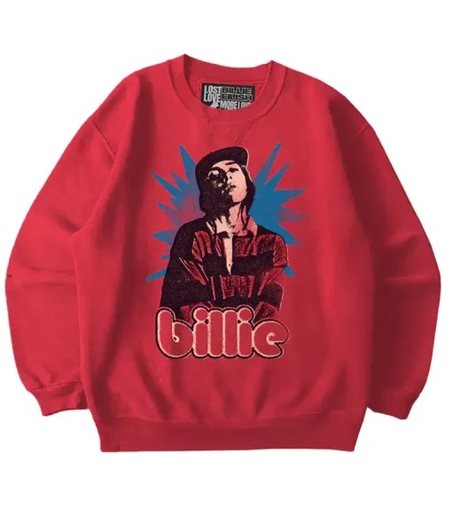 Billie inspired this graphic crewneck, combining pop-art visuals with bold red streetwear appeal. Fleece warmth, ribbed trims, portrait graphic, and relaxed cut enhanced everyday fan style.