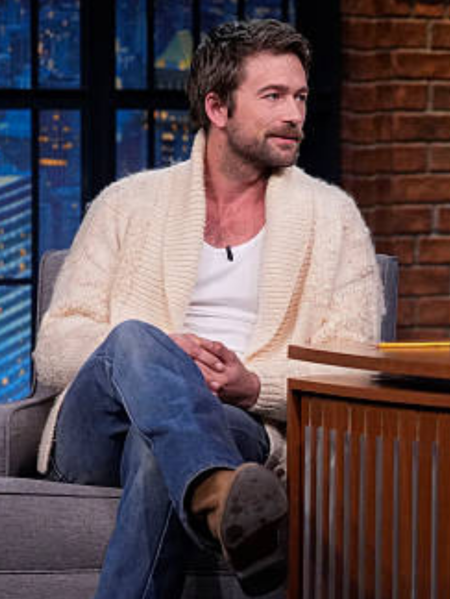 During his 1923 promotion, Sklenar wore a cozy-chic cream shawl-collar cardigan over a white ribbed tank. He paired mid-wash jeans with brown suede boots, blending rugged minimalism with soft textures and durable denim. The outfit created a relaxed yet polished look, ideal for a talk-show appearance.