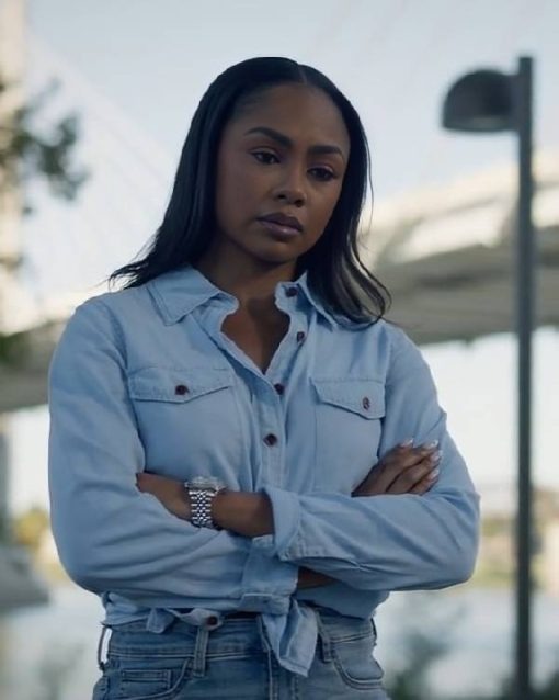 What makes this outfit noteworthy is how color and design details create a memorable look. For example, the light blue shirt adds freshness, while the tied hem adds modernity. Furthermore, the clean lines of the jeans maintain balance and complete the polished ensemble. This combination proves that thoughtful styling allows even simple outfits to convey confidence effectively. For those replicating Brittany’s style from Checkmate (2025), consider these actionable tips: First, focus on pastel colors; soft hues like baby blue brighten outfits while remaining composed. Next, incorporate subtle details; chest pockets, contrasting buttons, or tied hems elevate basic pieces. Additionally, balance statement tops with classic, understated bottoms like high-waisted jeans for refinement. Finally, choose minimal accessories, letting metallic or neutral pieces enhance without overpowering the outfit.