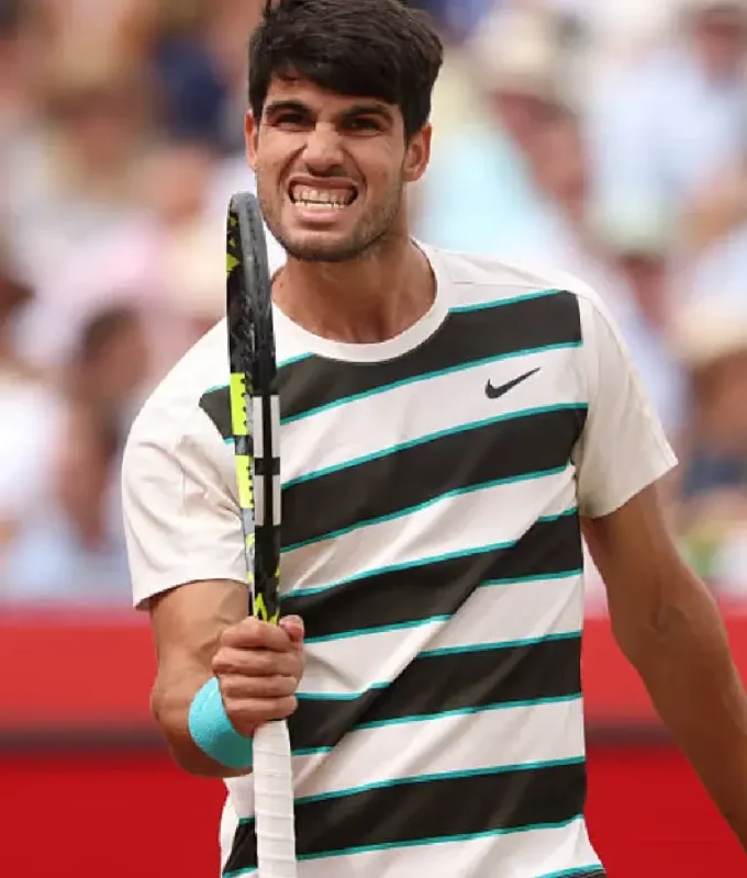 Carlos wore this blue t-shirt during the Queens Club 2025 final match in June. Its classic cut and soft fabric offer relaxed comfort. The design celebrates his past tournament success while remaining stylish for everyday wear. Fans can embrace a sporty, nostalgic vibe with this tournament-inspired shirt.
