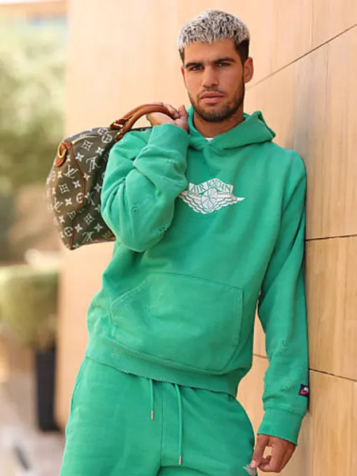 Step into elite tennis style with the Carlos Alcaraz Six Kings Slam Riyadh 2025 Hoodie — a bold kelly green Air Jordan piece that blends athletic confidence with streetwear flair, worn by Alcaraz ahead of his Riyadh final against Jannik Sinner.