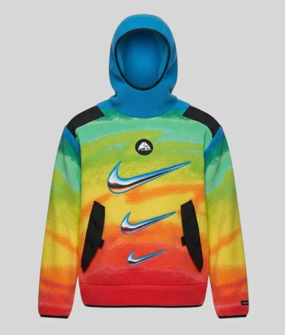 CPFM X ACG Balaclava Hoodie blends experimental streetwear with technical outdoor design, creating bold style and function. Moreover, CPFM and Nike ACG collaboration inspires individuality-driven performance fashion enthusiasts seeking standout pieces. Plush fleece construction delivers comfort while showcasing horizontal rainbow ombre that grabs attention instantly. Additionally, gradient flows smoothly from cool greens into yellows, oranges, and deep reds for striking visual effect. Similarly, MM Bape Full Zip Hoodie showcases strong streetwear identity with bold design approach overall. It serves as perfect alternative for fashion lovers preferring statement pieces with everyday comfort.
