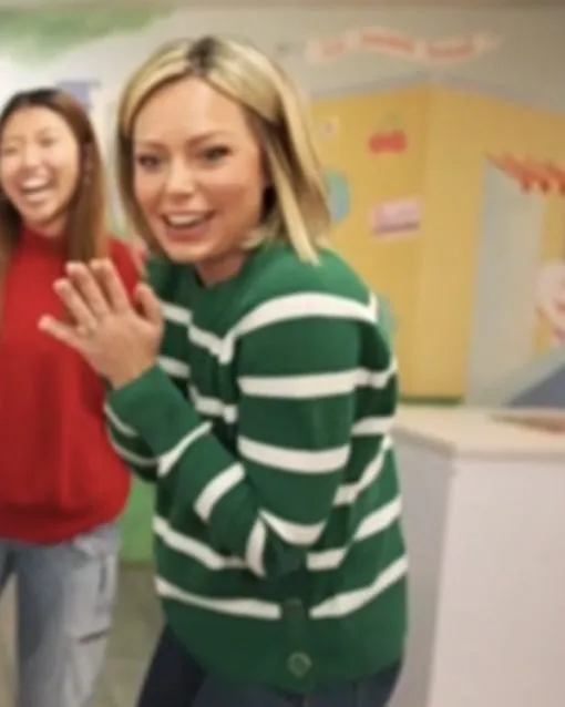 The green striped sweater styled by the Dylan Dreyer offers a relaxed, cozy feel while still looking polished. It’s an easy, wearable piece that fits seamlessly into a busy broadcast schedule.