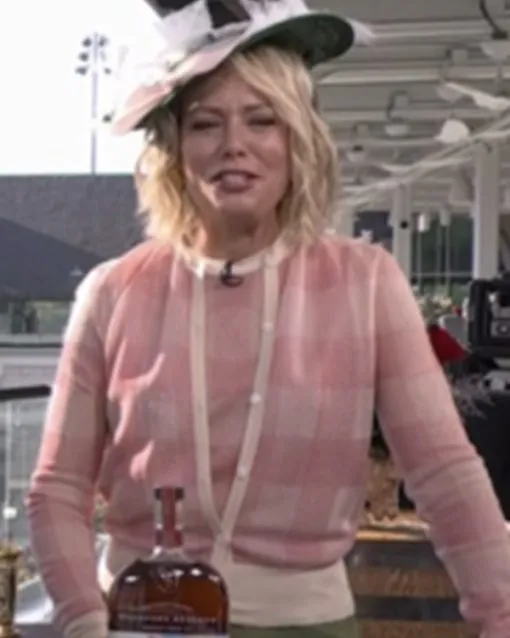 The Dylan Dreyer`s pink checkered cardigan brings warmth and approachability to studio outfits. It’s perfect for layering over simple tops, adding color and texture without overwhelming the look.