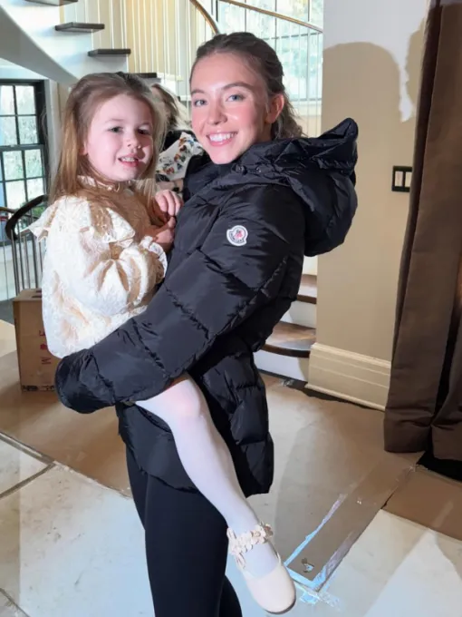 Sydney Sweeney styles this hooded black puffer jacket in the set of The Housemaid movie, giving the exlusive casual vibes.