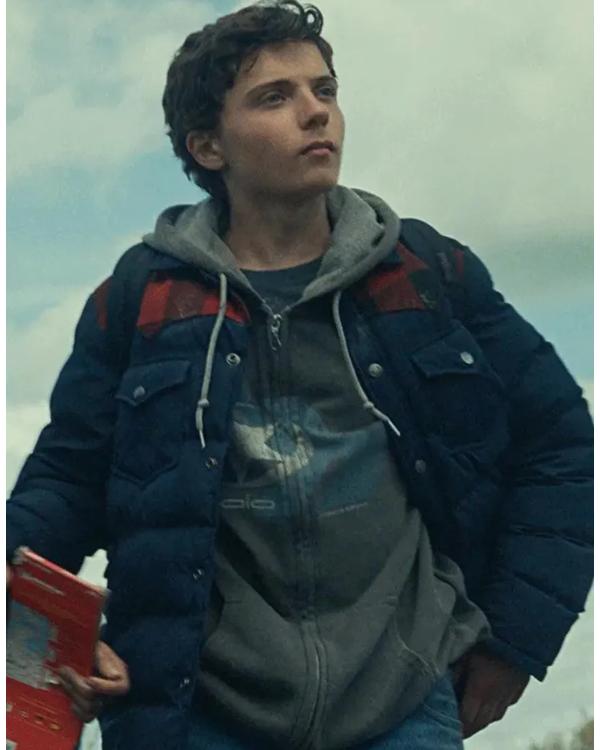 Nathan Garrity represents hope for the future. He leads a generation through a broken world. His jacket reflects youth and resilience. Designers use horizontal baffle quilting for insulation. They shape a Western-style pointed shoulder yoke. They add chest flap pockets with snap closures. They hide a zipper beneath a snap placket. They build a structured stand-up collar. They color the base deep navy blue. They add red and black buffalo plaid shoulders.