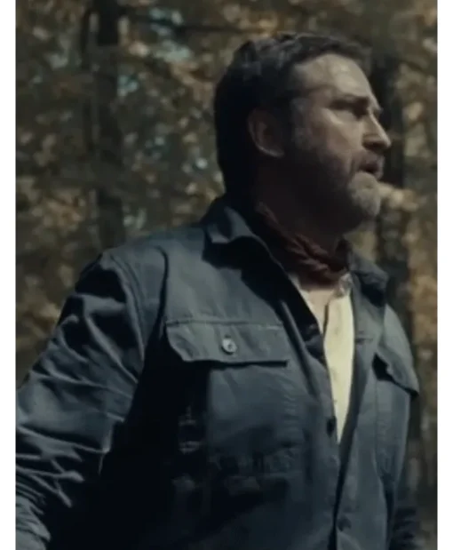 Gerard Butler plays John Garrity with emotional depth. He battles radiation illness and protects his family. His wardrobe shows quiet strength and grounded realism. The William Jacket delivers minimalist tactical style. It features a military-inspired overshirt shacket design. It includes a standard point collar. It has dual chest patch pockets. The pockets feature squared protective flaps. It uses a five-button front placket closure. It includes buttoned barrel cuffs for structure. It features a straight-cut hem for layering.