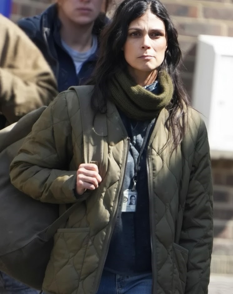 Overcast lighting shifts it toward deep charcoal. The matte brushed wool texture eliminates shine. The fabric rejects glamour and embraces strength. She layers it over a grey turtleneck. She adds an olive quilted liner underneath. The contrast creates intentional visual balance. The outer layer signals structured leadership. The inner layers deliver practical protection. The tailoring draws from maritime influence. The design also reflects military heritage. The silhouette feels timeless and powerful. This coat proves structure creates authority in survival.