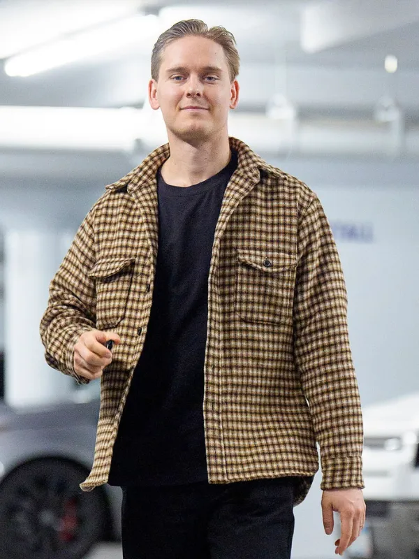 Kevin Lankinen rocks a stylish plaid shacket with utility pockets and a warm, brushed texture. Perfect for game-day fashion and casual layering.