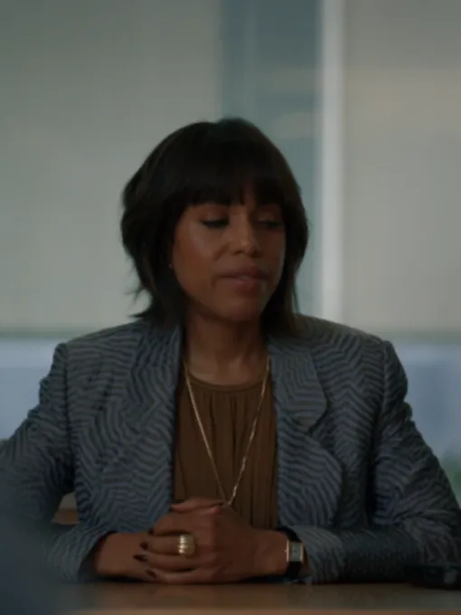 The grey blazer delivers refined drama and high-fashion elegance inspired Eleanor’s on-screen style. Moreover, Kerry Washington wears it in Episode “Monster.” It establishes bold, sophisticated presence and defines modern luxury tailoring. Additionally, its jacquard weave showcases zigzag tiger-stripe chevron pattern. This creates textured animalier aesthetic, both timeless and contemporary. The colorway blends steel blue, slate grey tones. Additionally, it includes champagne gold and silver-grey metallic sheen. Lighting shifts enhance its dynamic visual depth. Tailored full-length sleeves ensure durability and structure. The silk-wool or synthetic blend resists wrinkles. Stylists pair it with pleated neck top in bronze or ochre. Furthermore, they add gold jewelry and leather-strap timepiece.