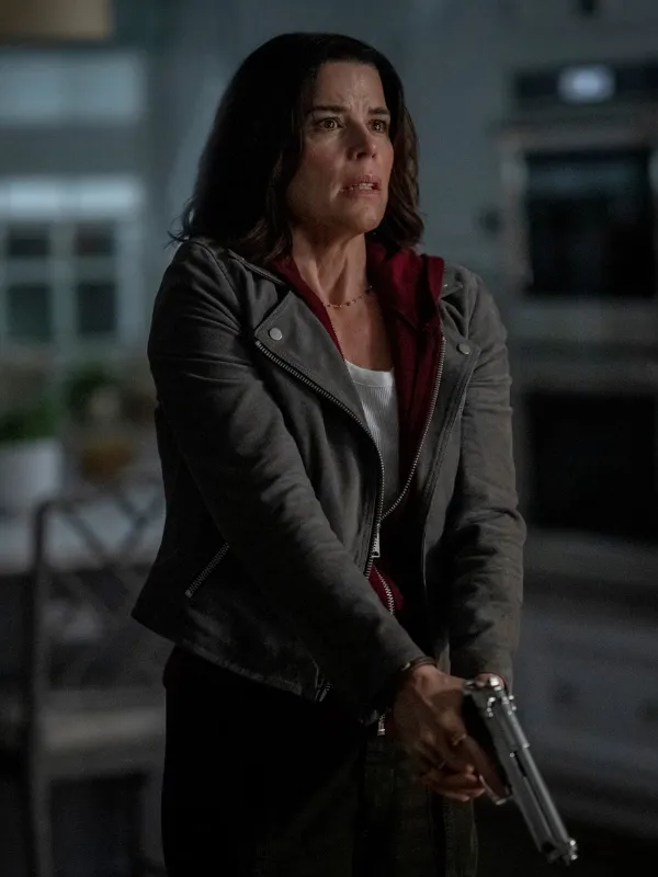 Sidney Prescott returns in Scream 7 wearing a suede jacket. The look stands among her most celebrated modern outfits. Overall, the piece embodies a classic biker jacket style. The jacket uses soft suede leather throughout. It shows a deep charcoal-grey tone. A distressed matte finish subtly shifts under different lighting. Classic biker elements define the overall design. The jacket features an asymmetrical zipper closure. It includes snap-down notched lapels. It adds zippered cuffs for edge. Slanted waist pockets complete the biker styling. A smooth viscose lining enhances comfort. The jacket layers easily over hoodies and tanks. This layering reinforces Sidney’s final girl armor. The jacket feels practical, resilient, and unapologetically strong. It represents Sidney’s evolution from survivor to protector.