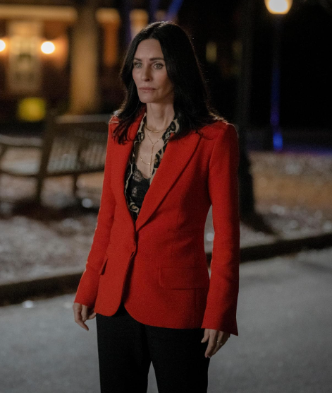 Gale Weathers commands attention in Scream 7 wearing bold red. She wears a single-breasted blazer with vibrant red hue. Notch lapels frame her shoulders, creating sharp structured lines. A single-button closure secures the blazer neatly in front. Flap waist pockets add stylish practicality to the design. Structured suiting fabric delivers smooth matte texture and elegance. Full viscose lining provides comfort throughout every scene worn. She pairs it with patterned tops or sleek black trousers. The blazer symbolizes her evolution from reporter to protector. Confidence radiates visibly, stitched into every seam perfectly.
