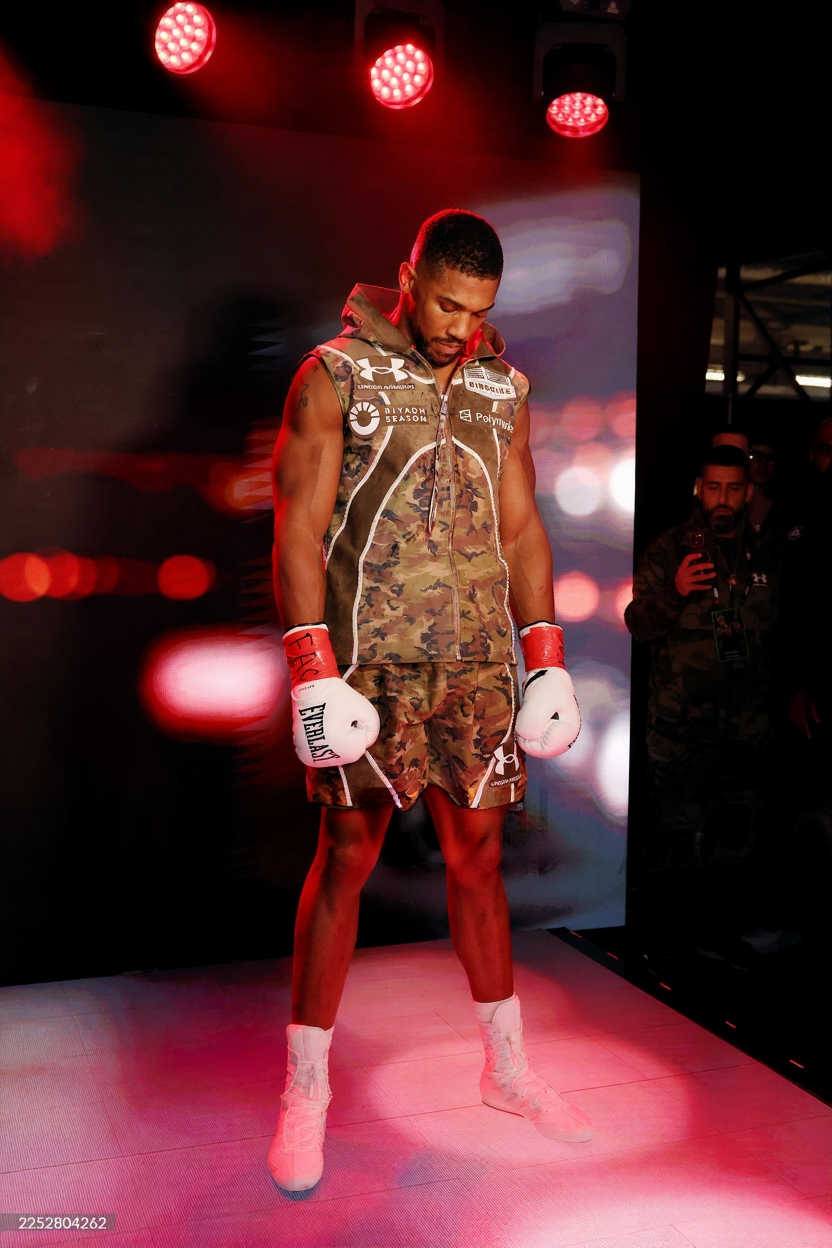 Anthony Joshua emphasized understated aggression and athletic functionality. He walked to the ring wearing a custom sleeveless hoodie. The hoodie displayed camouflage, blending streetwear with personal branding.