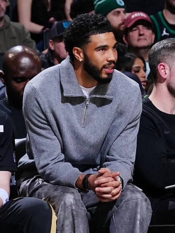 Jayson Tatum wears a Heather Grey Quarter-Zip Sweatshirt. The sweatshirt combines comfort, luxury, and modern streetwear style same as Taylor Swift Opalite Sweatshirt. It features a high-quality knit for a premium feel. The drop-shoulder fit gives a relaxed, fashionable look. A sleek silver zipper enhances the sweatshirt’s stylish design. Fans elevate their NBA fashion with this courtside piece. The Celeb Jacket offers this stylish sweatshirt to buy.