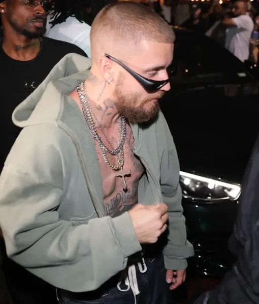 Justin wears this green hoodie on October 9, 2025, in Los Angeles as a celebrity sightseeing. This fleece zip hoodie balances structure and comfort. A hooded collar, ribbed cuffs, and front pouch pocket add practicality. The muted green shade gives it understated street appeal, perfect for layering over tees or under jackets.
