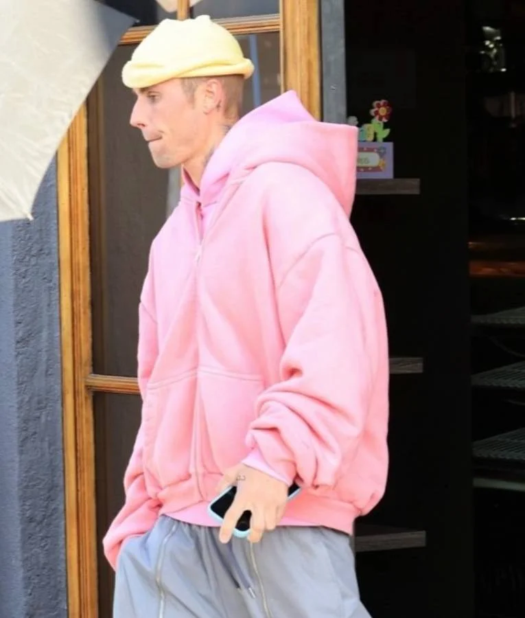 A fleece zip-up hoodie with long sleeves, rib-knit cuffs, and a drawstring hood. The soft pink shade adds a playful contrast to Bieber’s. Otherwise muted palette, showing his comfort with standout colors.