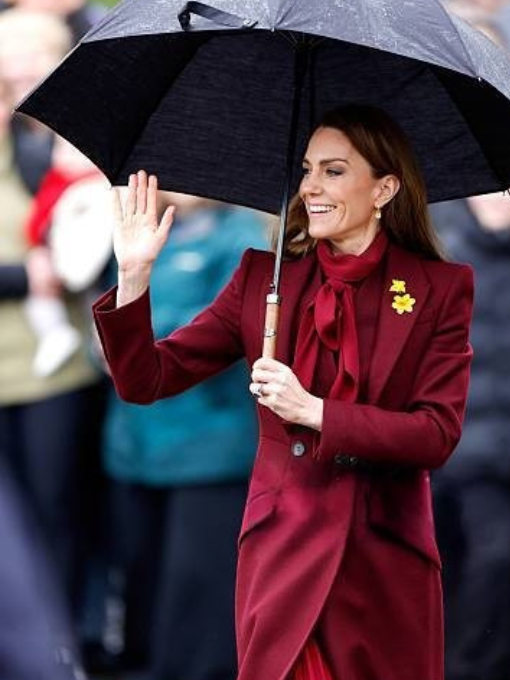Catherine, Princess of Wales sets the benchmark for refined monochrome dressing. On February 26, 2026, she visited Oriel Davies Gallery in Newtown, Wales. She wore a striking burgundy ensemble during the appearance. The outfit balanced sophistication with seasonal practicality. The Prince and Princess of Wales visited Powys before St David’s Day. They honored community initiatives across the region during the visit. Rainy winter weather surrounded the engagement that day. She sheltered gracefully under an umbrella in the rain. Kate Middleton maintained impeccably polished fashion despite the weather.