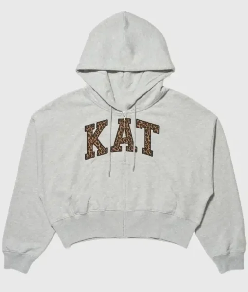 First, the bold “KAT” lettering defines the hoodie’s varsity-inspired aesthetic on the front. Moreover, the collegiate-style typography delivers a timeless and classic appeal. At the same time, the leopard print fill introduces a playful and eye-catching contrast. Additionally, a subtle black outline enhances the design with depth and sharp definition. Meanwhile, the tonal silver zipper and matching grey drawstrings complete the cohesive look. As a result, these elements create a sleek and polished finish.