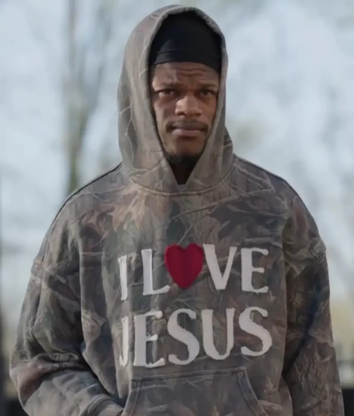 Lamar Jackson “I Love Jesus” Chenille Appliqué Hoodie with Red Heart Accent & Oversized Camouflage Streetwear Style