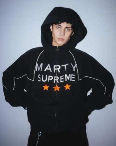 The jacket features deep matte black as its sleek primary color. Bold, all-caps “MARTY SUPREME” prints across the chest, stacked neatly. “Marty” sits above “Supreme,” creating a strong layered text effect. Three vibrant red stars below the text add playful color pops. Silver or metallic grey text completes graphics with reflective sheen under lighting.