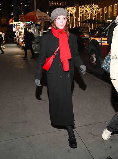 Laufey’s accessories elevate the monochrome coat into a striking winter statement. A vivid red scarf provides warmth and bold color contrast effectively. The matching red crossbody bag unifies the entire outfit’s palette. Gray beret and gloves add soft, Parisian elegance to her look. Chunky black loafers ground the ensemble, giving modern, youthful finishing touches.