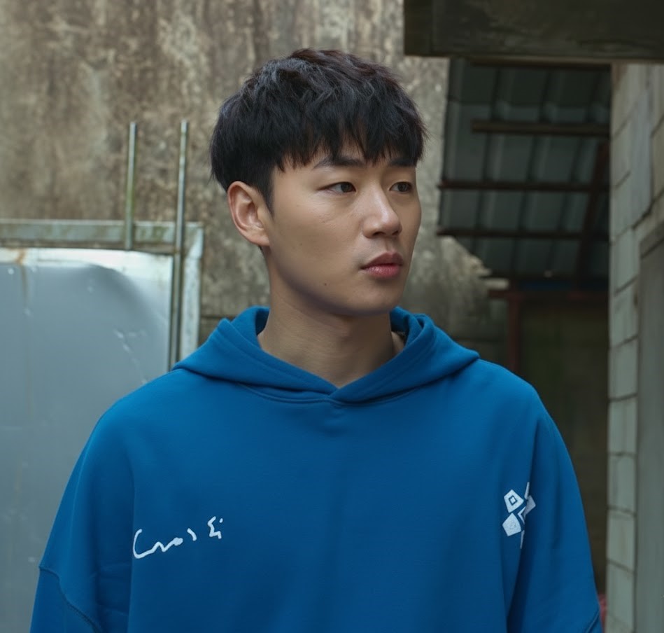 Lee Min-Jae embraces youthful rebellion through vibrant color. He wears a medium blue Zara hoodie confidently. Designers print white graphics across the chest. They add a large matching back graphic boldly. A front pouch pocket supports casual convenience. Ribbed cuffs secure the long sleeves comfortably. Soft brushed lining enhances warmth and texture. The relaxed fit encourages natural movement. The collaboration piece connects fashion with streaming culture. This hoodie highlights Hyun-tak’s expressive individuality clearly.