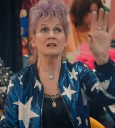 Lorraine Ashbourne redefines modern fashion through her Riot Women S01 ensemble. She wears a deep blue bomber jacket adorned with striking stars. The expressive design radiates empowerment, creativity, and effortless sophistication. Her look proves fashion embodies confidence and storytelling beyond fabric alone. Lorraine completely owns this outfit, turning sequins into a season-defining statement.