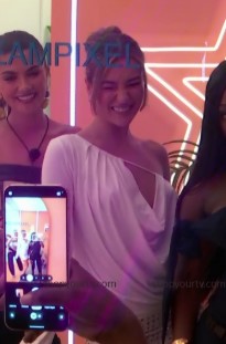 Millie lit up the night in a fully sequined orange mini dress that shimmered from every angle. High-shine sequins densely covered the non-stretch fabric and created a molten, liquid-like glow under the villa lights. A soft cowl neckline draped across her chest and balanced the bold sparkle with a touch of elegance.