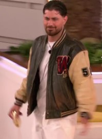 Scott brought streetwear energy into the villa with a varsity jacket that made a strong statement. The jacket featured a distressed leather body with contrasting cream sleeves for bold visual contrast. A burgundy and gold “W 72” patch dominated the chest and drew immediate attention. A “5” patch on the sleeve added clear collegiate authenticity to the design. Striped ribbed trim at the collar, cuffs, and hem framed the look with sporty structure. A snap-button front and slanted welt pockets kept the jacket classic, practical, and functional.