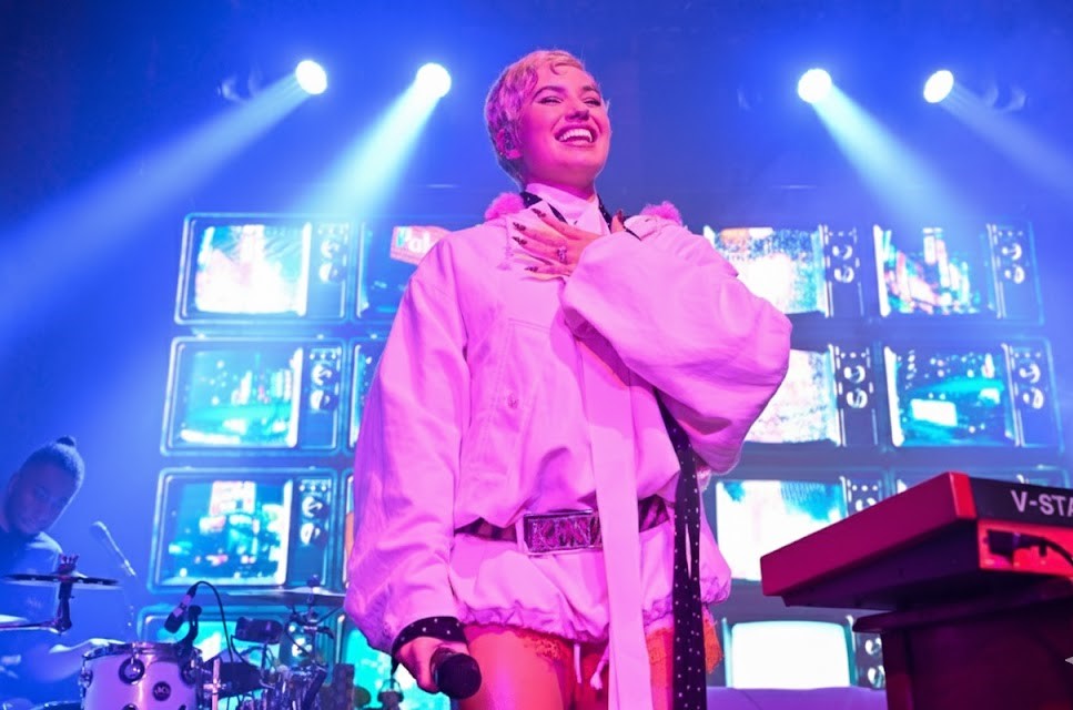 The jacket featured light pink or off-white shades under lighting. Intense pink stage lights created a dreamy, blush-toned glowing effect. The look appeared striking, romantic, and edgy under stage illumination. Mabel proved subtle hues can stand out in perfect settings.