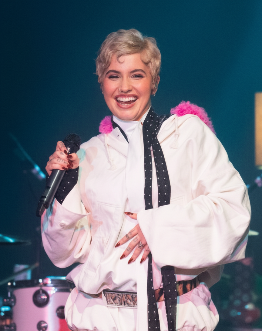 A high-collared neckline peeked out, adding refined layered style. Mabel paired it with a long, dark tie or scarf. The accessory flowed elegantly, enhancing her outfit’s dynamic stage presence. It gave the look a chic, effortless, and urban edge.