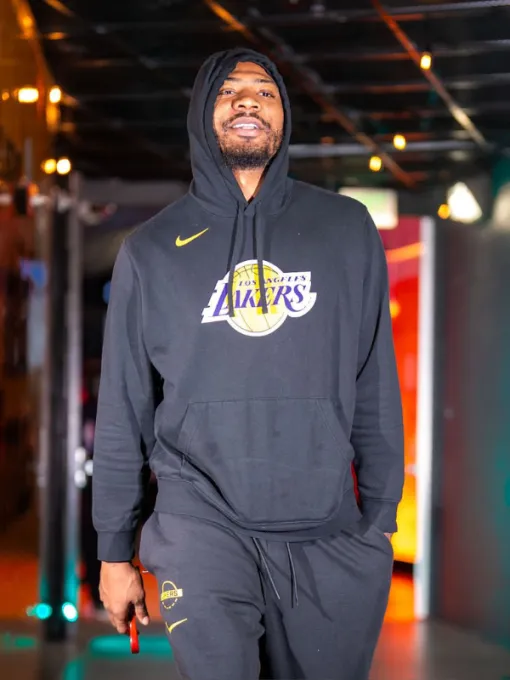 The front displays a Lakers logo in purple and gold. It places the logo over a white basketball backdrop graphic. Additionally, a metallic gold Nike Swoosh sits on chest. Moreover, black flat-knit drawstrings secure the structured hood. The design includes a kangaroo pocket for utility storage. Ribbed cuffs and hem enhance fit and heat retention. Matching joggers complete the set with gold Swoosh detailing.