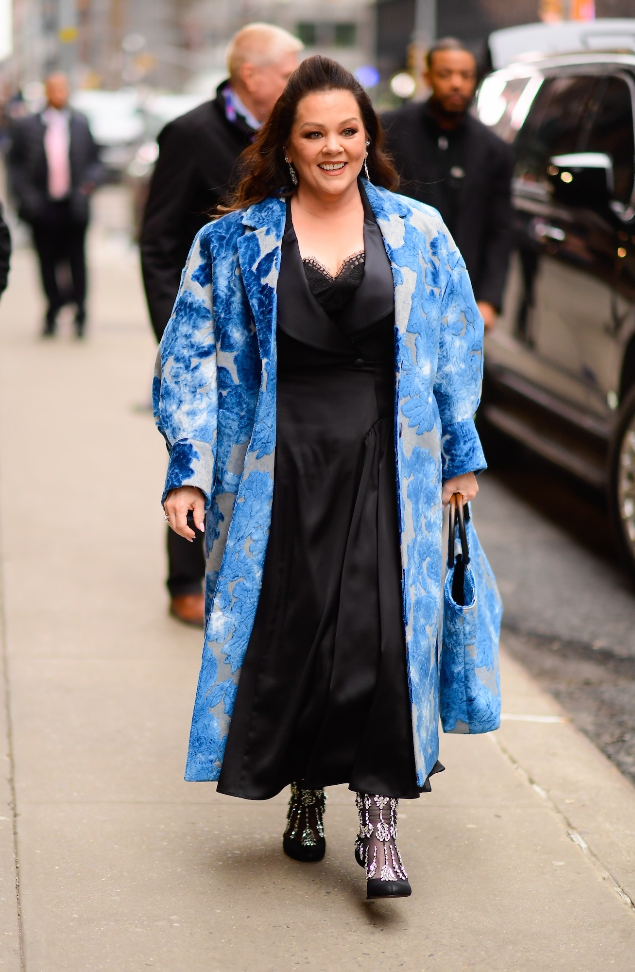 Melissa McCarthy Turns Heads in a Blue Floral Coat in New York City