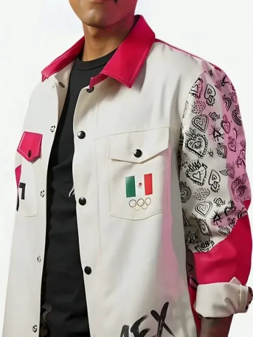 Next, national branding appears clearly: the left chest pocket displays the Mexican flag above Olympic rings. Moreover, the bottom left hem showcases the abbreviation “MEX” in stylized, hand-painted black font. Furthermore, intricate black line art decorates the lower sleeves and the jacket’s right side. These patterns, including milagritos and heart motifs, provide artisanal cultural texture to the modern silhouette.