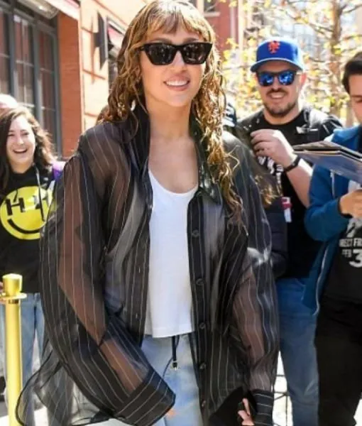 You can shop Miley Cyrus’s sheer black pinstripe shirt directly from The Celeb Jackets to recreate this stylish NYC street-style look.