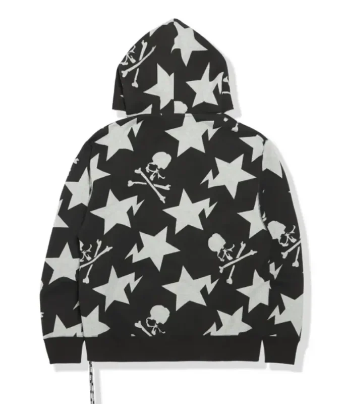 Oversized shooting “Sta” star graphics define BAPE’s iconic design language throughout hoodie. Meanwhile, skull and crossbones motifs from Mastermind Japan add a rebellious and edgy character. Consequently, this combination creates a fearless and energetic fashion statement that reflects true collaboration culture in streetwear. The hoodie features a full-zip construction with a premium silver-tone metal zipper running through the hood.